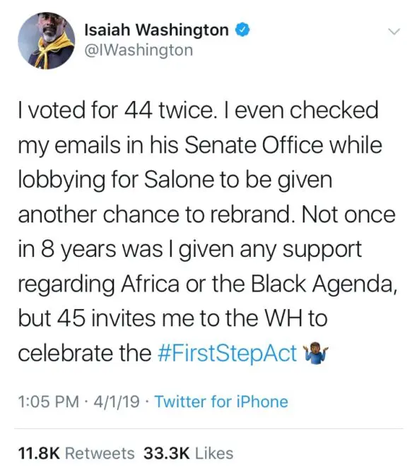 “I voted for 44 twice. I even checked my emails in his Senate Office while lobbying for Salone to be given another chance to rebrand. Not once in 8 years was I given any support regarding Africa or the Black Agenda, but 45 invites me to the WH to celebrate the #FirstStepAct.”