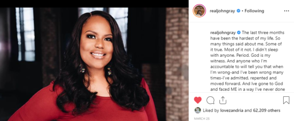 Weeks before the interview, Pastor John Gray took to Instagram to defend his wife while insisting the post would be the last time he publicly addressed their scandal. He posted this message with a photo of his beautiful First Lady: