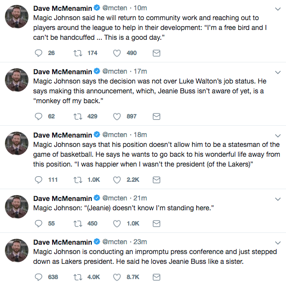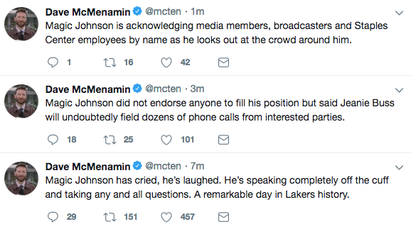 During his press conference, Johnson also said that owner Jeanie Buss and general manager Rob Pelinka had no idea he was stepping down.