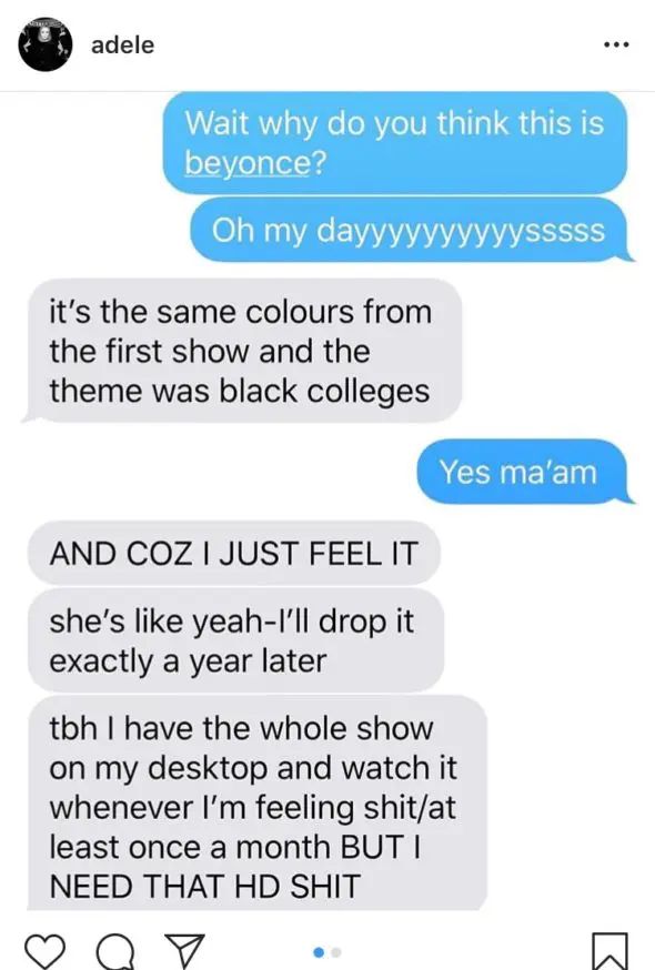 In a screenshot of text messages, Adele expresses her love of Beyoncé and her anticipation of the documentary, writing “Oh my dayyyyyyyyyysssss. Why does she always know when I need her.”