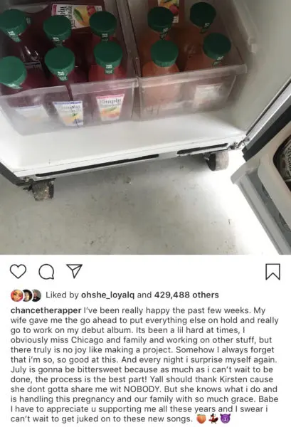 Fresh off of the jet from their honeymoon, rapper Chance The Rapper is back in the studio as he gives his appreciation to his newly wed wife, Kirsten Bennett. The 25-year-old rapper (real name Chancelor Bennett) shares on social media how supportive Kirsten has been, even through her pregnancy with the couple’s second child. Chance writes,