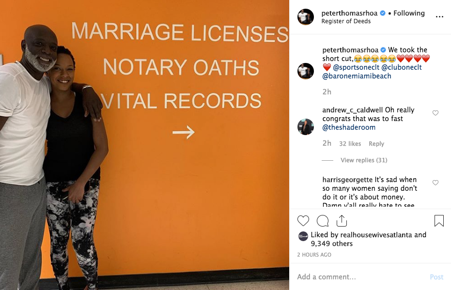 Congratulations may be in order for Peter Thomas. According to a recent social media post, the former Real Housewives of Atlanta cast member may have gotten married to his girlfriend Toni Scott. Based on the photo and caption, it looks like they not only obtained a marriage license on Friday, April 12, but also had witnesses. Standing in front of a sign that read Marriage Licenses Notary Oaths Vital Records, Peter captioned the post: