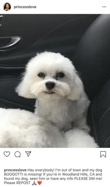 “$20,000 REWARD!! Boogotti is a 3 1/2 pound white Maltese. He was lost in Woodland Hills, CA. Please DM with his photo if you’ve found him ??”