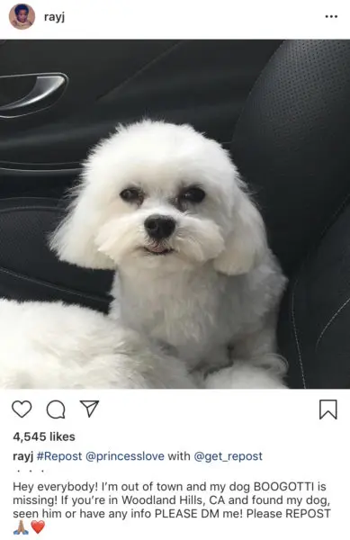 Her husband, Ray J, reposted the message in an effort to find the pup.