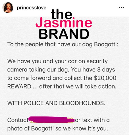 “To the people that have our dog Boogotti: We have you and your car on security camera taking our dog. You have 3 days to come forward and collect the $20,000 REWARD … after that we will take action. WITH POLICE AND BLOODHOUNDS. Contact [phone number] or text with a photo of Boogotti so we know it’s you.”