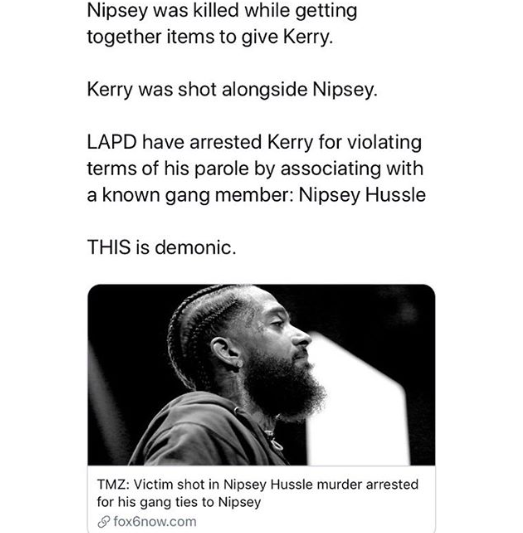 “Nipsey was killed while getting together items to give Kerry. Kerry was shot alongside Nipsey. LAPD have arrested Kerry for violating terms of his parole by associating with a known gang member: Nipsey Hussle THIS is demonic.”