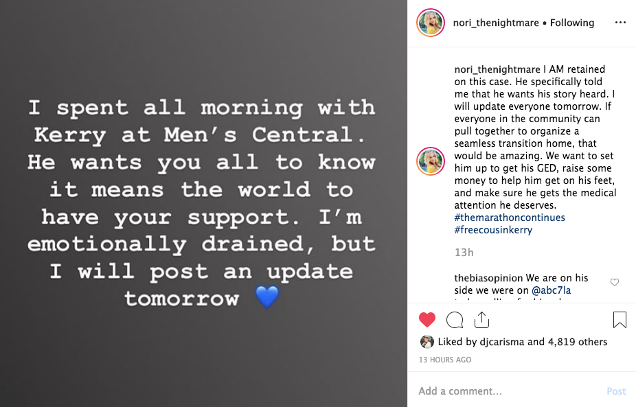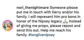 “Someone please put me in touch with Kerry and/or his family. I will represent him pro bono in honor of the Nipsey legacy ?? instead of giving me props, please repost and send this out. Help me reach his family. #longlivenipsey“