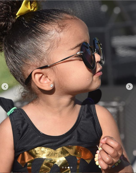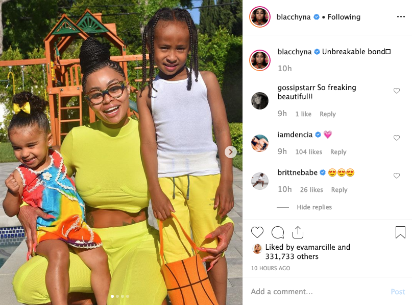 Wearing a neon yellow mid-drift set, Chyna wears colorful glasses and a braided bun. She holds Dream on her lap, and holds Cairo necks to her as she captions the post