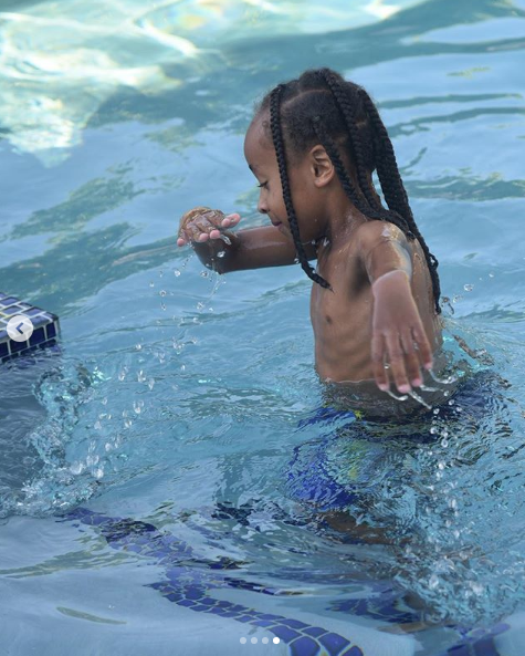 She also shares a sweet photo of Dream wearing shades, while Cairo plays in the pool.