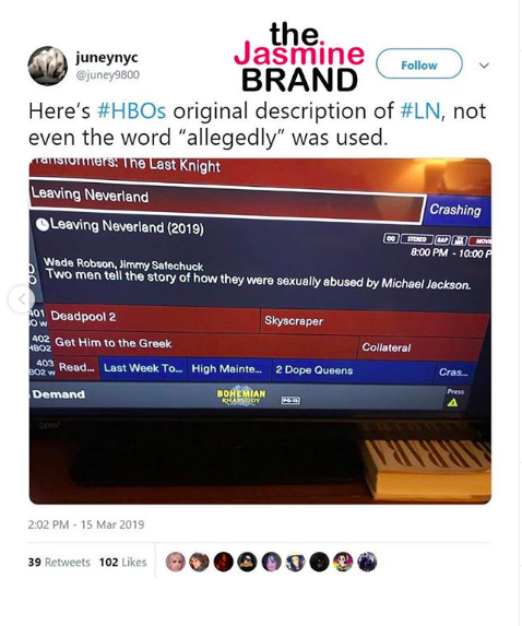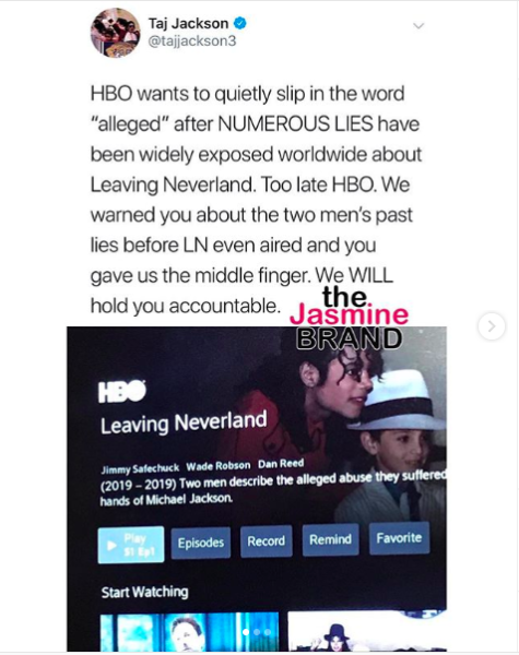 “HBO wants to quietly slip in the world ‘alleged’ after NUMEROUS LIES have been widely exposed worldwide about Leaving Neverland. Too late HBO. We warned you about the two men’s past lies before LN even aired and you gave us the middle finger. We WILL hold you accountable.”
