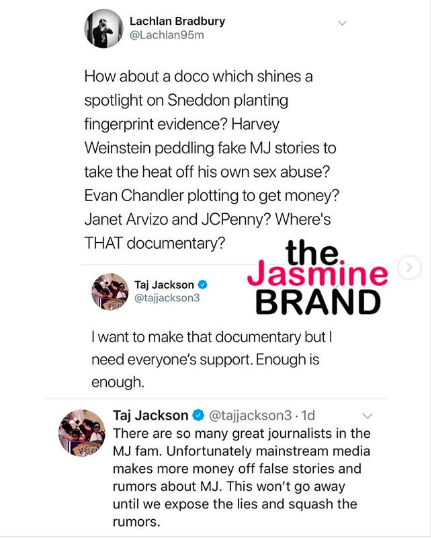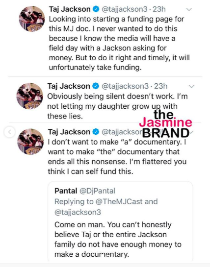 “Looking into starting a funding page for this MJ doc. I never wanted to do this because I know the media will have a field day with a Jackson asking for money. But to do it right and timely, it will unfortunately take funding…Obviously being silent doesn’t work. I’m not letting my daughter grow up with these lies…I don’t want to make “a” documentary. I want to make “the” documentary that ends all this nonsense. I’m flattered you think I can self-fund this.”