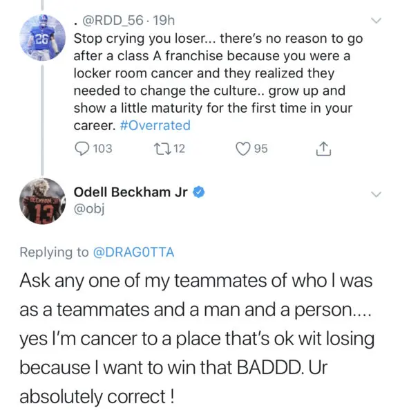 Soon after, a fan on Twitter labeled him a “locker room cancer,” Beckham responded by criticizing his former team mate saying he is only a cancer to a place that’s okay wit losing.