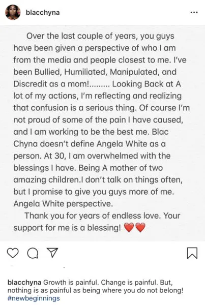 “Blac Chyna doesn’t define Angela White as a person. At 30, I am overwhelmed with the blessings I have. Being A mother of two amazing children. I don’t talk on things often, but I promise to give you guys more of me. Angela White perspective. Thank you for years of endless love. Your support for me is a blessing!”