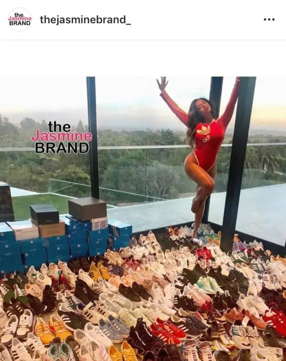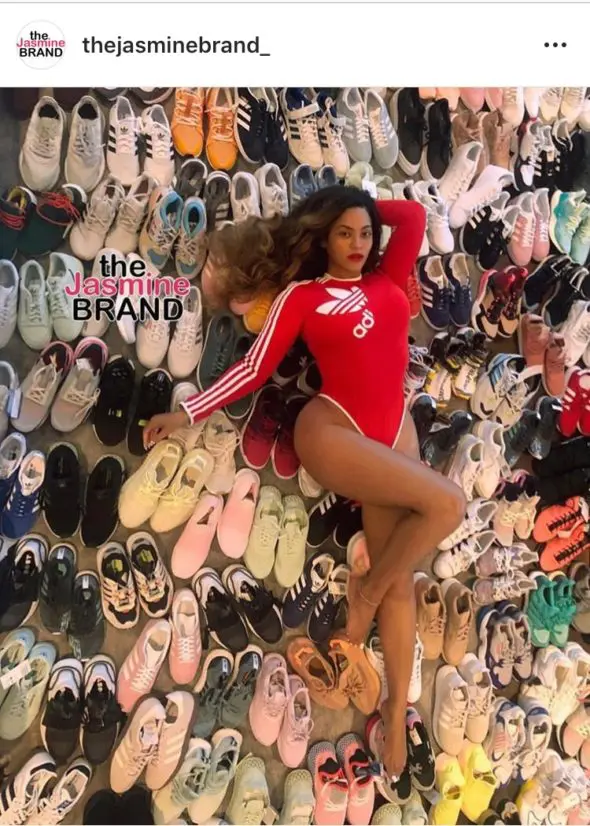 Less than a month later, Beyoncé has just posted a few photos of her fully repping the Adidas brand. In the photos, she seen wearing a red and white one-piece swimsuit with Adidas on the front, surrounded by dozens of pairs of Adidas sneakers in various colorways.