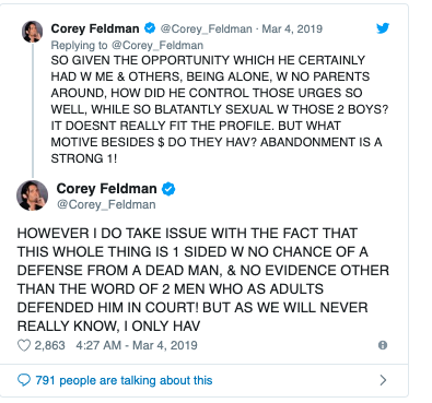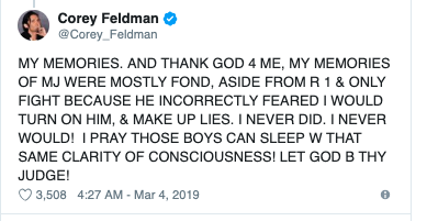 Feldman is one of the latest celebrities to speak out about it. He said after watching the documentary with his family, he realized he had a similar past with Jackson as the two accusers. He stated in an interview: