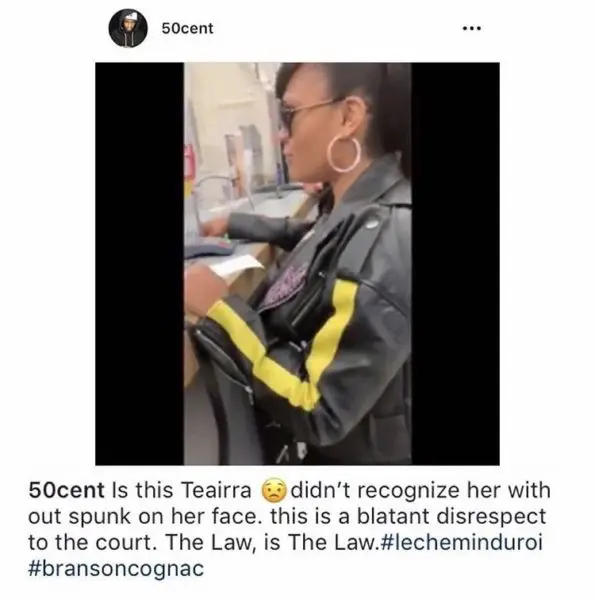 “@50cent Is this Teairra didn’t recognize her with out sp*nk on her face. this is a blatant disrespect to the court. The Law, is The Law.#lecheminduroi #bransoncognac”