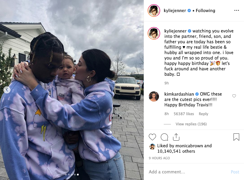 Kylie and Travis welcomed their first child together, a daughter named Stormi, in 2018. This week, Kylie wished Travis a happy birthday, noting that she’d like to ‘f**k around and have another baby’. Sharing a series of photos of the rapper she writes,