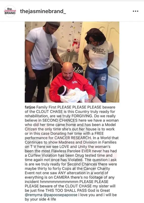 “Family First PLEASE PLEASE PLEASE beware of the CLOUT CHASE is this Country truly ready for rehabilitation, are we truly FORGIVING. Do we really believe in SECOND CHANCES here we have a woman who did her time came home and has been a Model Citizen the only time she’s out her house is to work or in this case Donating her time with a FREE performance for CANCER RESEARCH. In a World that Continues to show Madness and Division in Families on T V here we see LOVE and Unity the woman’s been the most Flawless Parolee EVER never has had a Curfew Violation has been Drug tested time and time again not once has Violated. The question i ask is are we truly ready for Second Chances there were maybe thirty to forty Cops at the Cancer Charity Event not one saw ANY altercation in a world of everything is on CAMERA there’s no footage of any incident hmmmmmmmmmmmmm PLEASE PLEASE PLEASE beware of the CLOUT CHASE my sister will be just fine THIS TOO SHALL PASS God is Great @remyma @papoosepapoose i love you and i will be by your side 4 life”