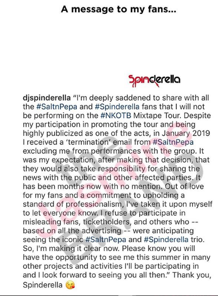 “I’m deeply saddened to share with all the #SaltnPepa and #Spinderella fans that I will not be performing on the #NKOTB Mixtape Tour. Despite my participation in promoting the tour and being highly publicized as one of the acts, in January 2019 I received a ‘termination’ email from #SaltnPepa excluding me from performances with the group. It was my expectation, after making that decision, that they would also take responsibility for sharing the news with the public and other affected parties.