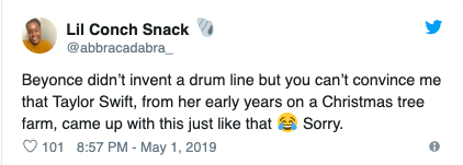 Me a Beyoncé fan showing my allegiance to her as I offer to sacrifice 6 of Taylor swift drummers from last night…. pic.twitter.com/85ovSAr7D7
