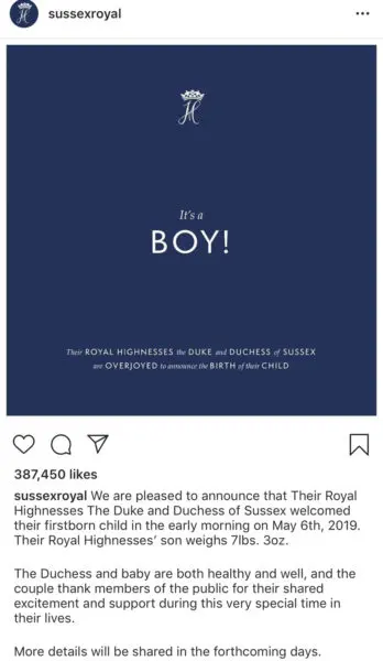 “We are pleased to announce that Their Royal Highnesses The Duke and Duchess of Sussex welcomed their firstborn child in the early morning on May 6th, 2019. Their Royal Highnesses’ son weighs 7lbs. 3oz. The Duchess and baby are both healthy and well, and the couple thank members of the public for their shared excitement and support during this very special time in their lives. More details will be shared in the forthcoming days.”