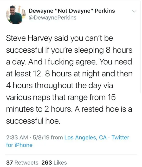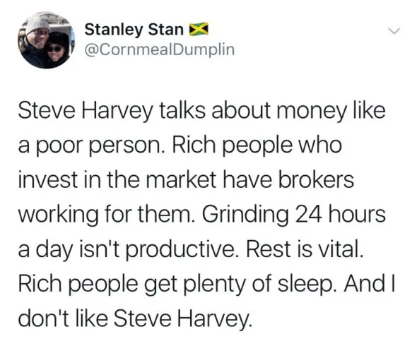 In a clip that went viral on Twitter, Harvey is seen speaking to an audience and firmly stressing that in order to be financially successful in life, you can’t afford to sleep for 8 hours a night. Almost immediately, the backlash against Harvey increased with every retweet the video received.