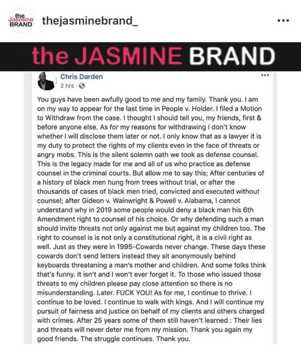 “These days these cowards don’t send letters instead they sit anonymously behind keyboards threatening a man’s mother and children. And some folks think that’s funny. It isn’t and I won’t ever forget it. To those who issued those threats to my children please pay close attention so there is no misunderstanding. Later. F**K YOU! As for me, I continue to thrive. I continue to be loved. I continue to walk with kings. And I will continue my pursuit of fairness and justice on behalf of my clients and others charged with crimes. After 25 years some of them still haven’t learned : Their lies and threats will never deter me from my mission. Thank you again my good friends. The struggle continues. Thank you.”