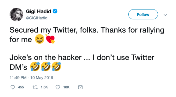 Gigi Hadid is all laughs after her Twitter account spewed hateful words and phrases on Friday. She confirmed that her account was hacked, and said she’s the one who had the last laugh.