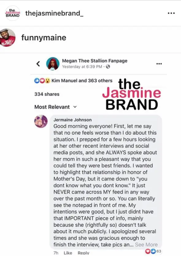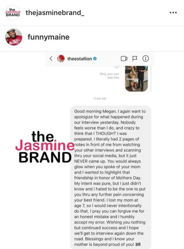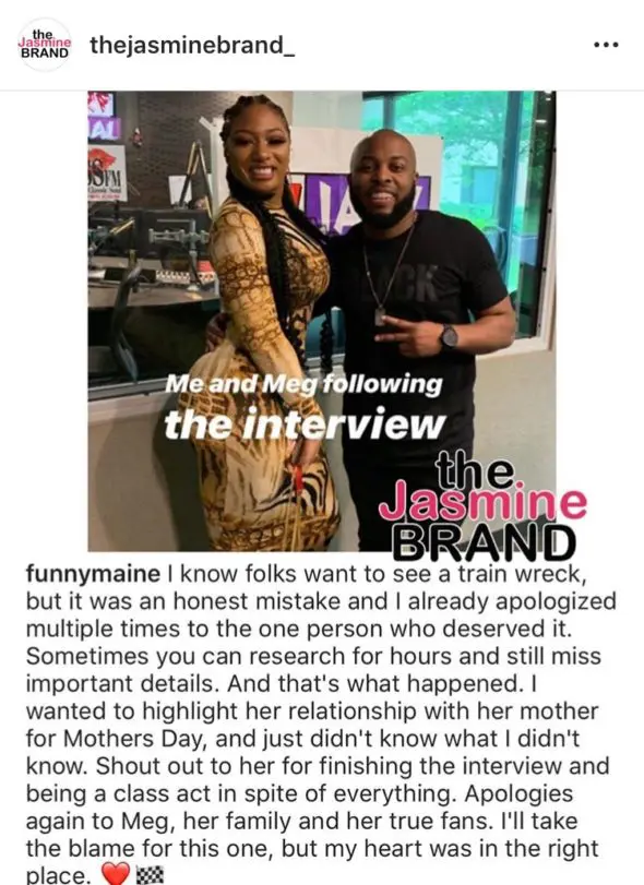 “I know folks want to see a train wreck, but it was an honest mistake and I already apologized multiple times to the one person who deserved it. Sometimes you can research for hours and still miss important details. And that’s what happened. I wanted to highlight her relationship with her mother for Mothers Day, and just didn’t know what I didn’t know. Shout out to her for finishing the interview and being a class act in spite of everything. Apologies again to Meg, her family and her true fans. I’ll take the blame for this one, but my heart was in the right place”
