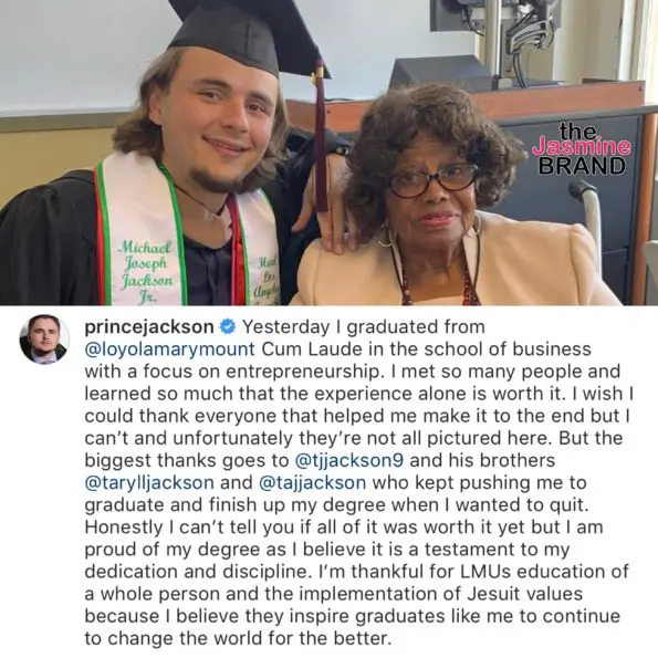 In addition, another graduate celebrated his accomplishment, son of Michael Jackson, Prince Jackson. The son of the King of Pop took to Instagram announcing his degree from Loyola Marymount University. He says,