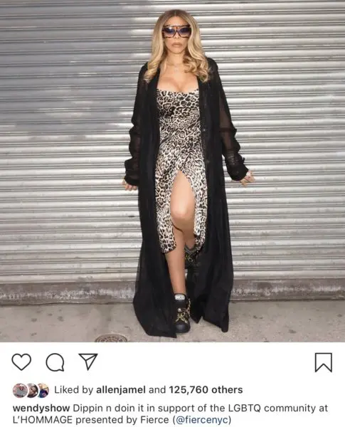 How you doing! Daytime talk show host, Wendy Williams poses for the camera on her way to an LGBTQ event in New York over the weekend. In the photo, the talk show host stuns in her signature curly and blond wig, black shades and a leopard dress. She pairs the look with a sheer black jacket with black and gold sneakers. She writes,