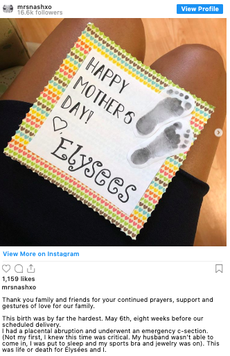 “This birth was by far the hardest. May 6th, eight weeks before our scheduled delivery. I had a placental abruption and underwent an emergency c-section. (Not my first, I knew this time was critical. My husband wasn’t able to come in, I was put to sleep and my sports bra and jewelry was on). This was life or death for Élysées and I.”