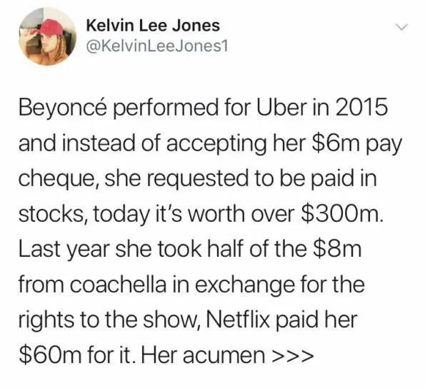 “Beyoncé performed for Uber in 2015 and instead of accepting her $6m pay cheque, she requested to be paid in stocks, today it’s worth over $300m. Last year she took half of the $8m from coachella in exchange for the rights to the show, Netflix paid her $60m for it. Her acumen >>>”