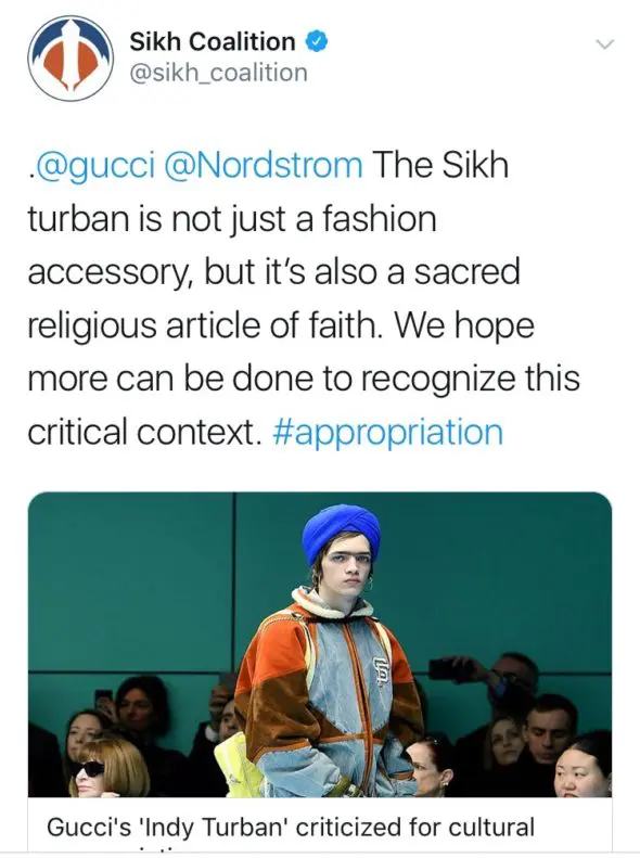 “The Sikh turban is not a fashion accessory, but it’s also a sacred religious article of faith. We hope more can be done to recognize this critical context. #appropriation.”