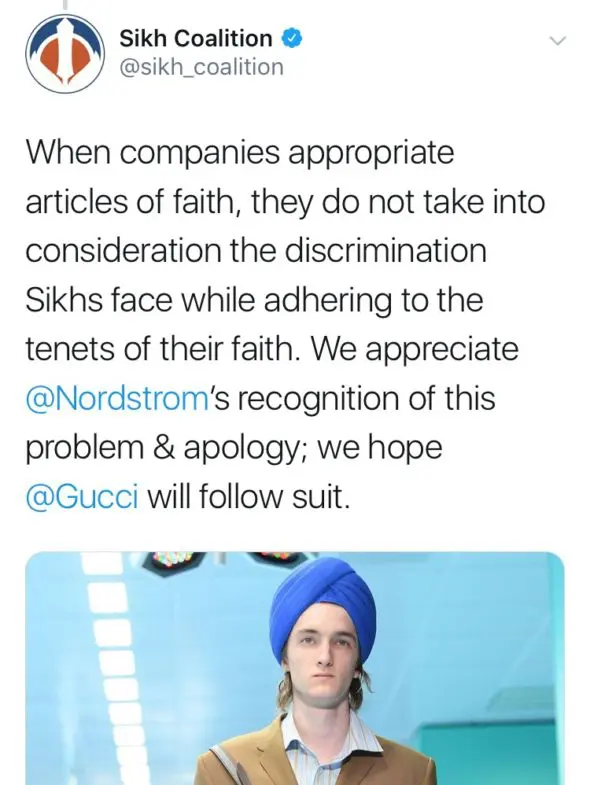 “When companies appropriate articles of faith, they do not take into consideration the discrimination Sikhs face while adhering to the tenets of their faith. We appreciate @Nordstrom’s recognition of this problem & apology; we hope @Gucci will follow suit.”