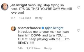 “Shemar Moore’s gay – he’s in the closet. He likes little boys. Nope, I love women. He don’t like Black women nope, I love women. He like skinny white women no, I love women in different all shapes, sizes, and color. How come we don’t see you with women? You don’t see me with little boys unless you’re lying on me.”