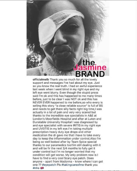 Mel B has spoken out after rumors swirled that she was doing just fine after suffering a Herpes outbreak that caused her to go temporarily go blind. The singer and TV personality took to Instagram to share her truth. She posted a snapshot of herself wearing an eyepatch. She wrote,