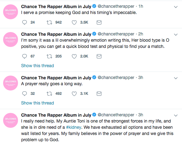 Chance The Rapper’s aunt is in desperate need of a kidney. On Thursday, the 26-year-old rapper shared that his family has exhausted all options and have been wait listed for years. Asking the public for prayers, he also shares that his aunt’s blood type is O positive.