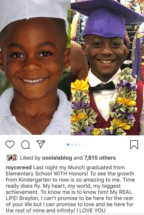 “Last night my Munch graduated from Elementary School WITH Honors! To see the growth from Kindergarten to now is so amazing to me. Time really does fly. My heart, my world, my biggest achievement. To know me is to know him! My REAL LIFE! Braylon, I can’t promise to be here for the rest of your life but I can promise to love and be here for the rest of mine and infinity! I LOVE YOU MooMooMunchkinAngelfaceBabycakes”
