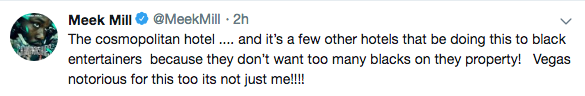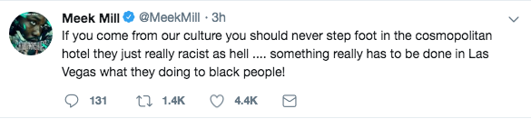 Meek Mill is calling out the Cosmopolitan Hotel in Las Vegas. The 32-year-old rapper says that hotel is racist and discriminates against black people and rappers. In fact, he says the hotel doesn’t want too many black on their property.