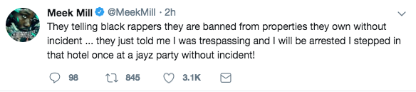 They telling black rappers they are banned from properties they own without incident … they just told me I was trespassing and I will be arrested I stepped in that hotel once at a jayz party without incident!