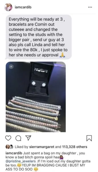 “Just spent a bag on my daughter, you know a bad b**ch gonna spoil haa. @pristine_jewelers. If I’m iced out my daughter gotta be too. YEUP IM BRAGGING CAUSE I BUST MY A** TO DO SO.”