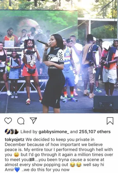 “@tokyojetz We decided to keep you private in December because of how important we believe peace is. My entire tour I performed through hell with you but I’d go through it again a million times over to meet you…you been tryna cause a scene at almost every show popping out well say hi Amir..we do this for you now”
