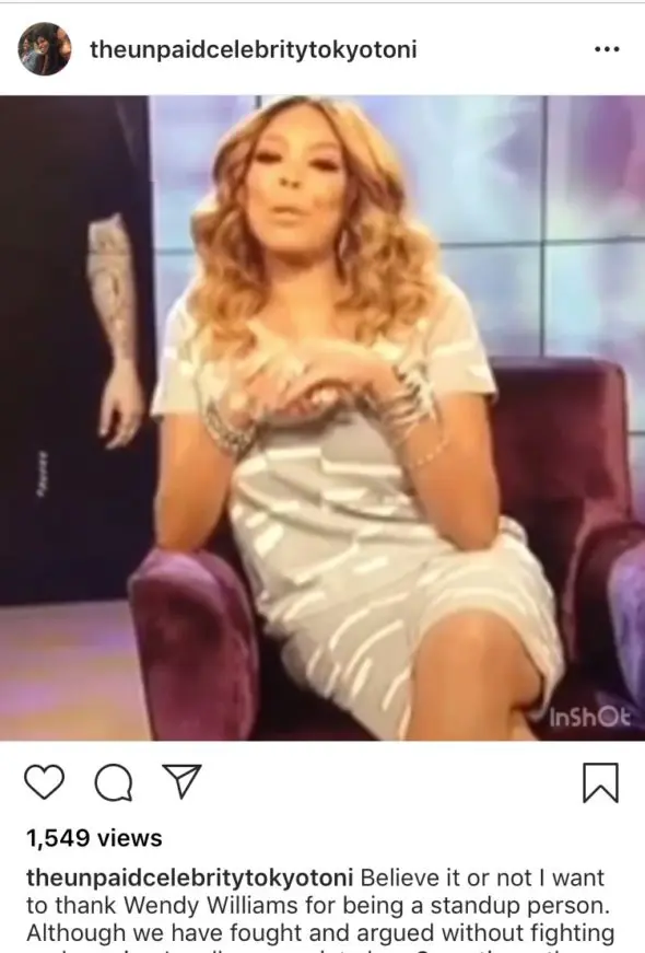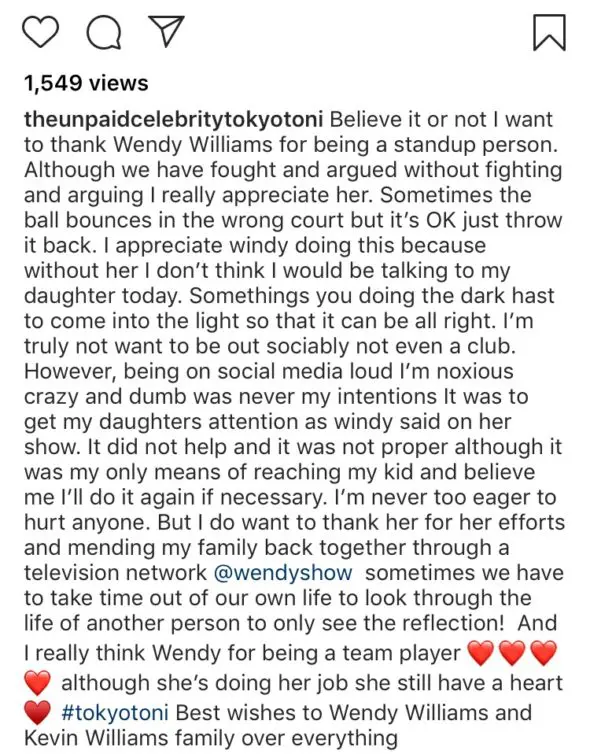 “Believe it or not I want to thank Wendy Williams for being a standup person. Although we have fought and argued without fighting and arguing I really appreciate her. Sometimes the ball bounces in the wrong court but it’s OK just throw it back. I appreciate windy doing this because without her I don’t think I would be talking to my daughter today. Somethings you doing the dark hast to come into the light so that it can be all right. I’m truly not want to be out sociably not even a club. However, being on social media loud I’m noxious crazy and dumb was never my intentions It was to get my daughters attention as windy said on her show. It did not help and it was not proper although it was my only means of reaching my kid and believe me I’ll do it again if necessary. I’m never too eager to hurt anyone. But I do want to thank her for her efforts and mending my family back together through a television network @wendyshow sometimes we have to take time out of our own life to look through the life of another person to only see the reflection! And I really think Wendy for being a team player ???????? although she’s doing her job she still have a heart ?? #tokyotoni Best wishes to Wendy Williams and Kevin Williams family over everything”