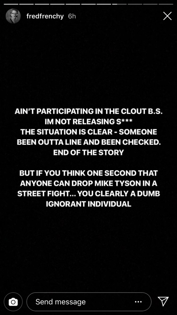 “Like I said s*** got a little heated at the @hotboxinpodcast . Win lose or draw I’m not going for it. @fredfrenchy your not to blame for me and @miketyson situation . A dispute amongst men is just between those 2 men… #West??”