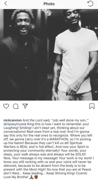 “And the Lord said, “Job well done my son..” @nipseyhussleKing this is how I want to remember you! Laughing! Smiling! I ain’t slept yet, thinking about our conversations! Real ones from a real one! And I’m gonna say this only for the real ones to recognize. Where you left off, we gonna carry one! It’s a MARATHON, so I’m picking up the baton! Because they can’t kill us all! Spiritual Warfare is REAL and in full effect. And now your Spirit is protecting your community eternally! Your words, your steps, your walk always was and always will be SOLID! Now, Your message is my message! Your work is my work! I know you still rocking with us and your voice will never be silenced, because to be absent from the body is to be present with the Most High! So now that you are at Peace don’t Rest… Keep leading… Keep Shining King! Cosmic Love My Brotha!”