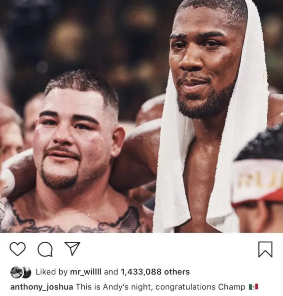 The former champion passes his title with a humble message to Ruiz posting a photo congratulating the newly crown champion. Joshua writes,