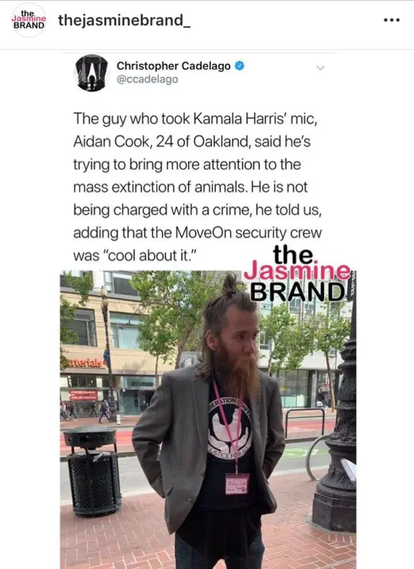 The man in question has been identified as 24-year-old Aidan Cook of Oakland, California. He reportedly took the mic from Harris to “bring more attention to the mass extinction of animals.” Cook was also not charged with a crime and claimed that security at MoveOn” was “cool about it.”