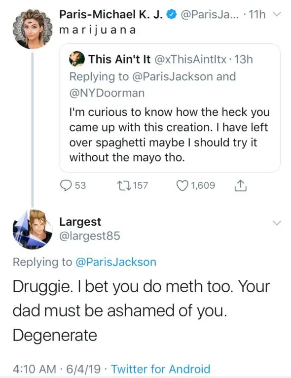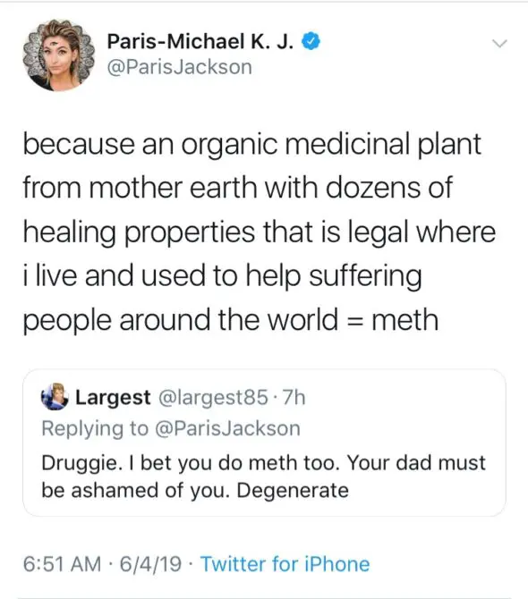 Paris Jackson has been pretty open about her marijuana usage in the past, but social media user recently took things to another level and accused Michael Jackson’s oldest daughter of being a drug addict addicted to methamphetamine.