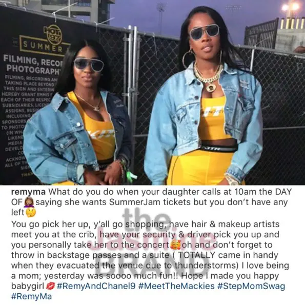 Rapper Remy Ma was spotted during the Summer Jam festivities over the weekend with step daughter, DeJanae Mackie. The mother of five went into mommy mode as her step daughter wanted to attend the festivities on the day of Summer Jam, and Remy made sure her daughter had an enjoyable experience. The Grammy nominated rapper and DeJanae made an entire girls day that included shopping, hair, and make-up appointments before attending. Remy posted a photo of their matching outfits that included jean jackets with yellow two piece Kith jump suit and matching high heels. Remy shared a photo of their cute moment captioning the post: